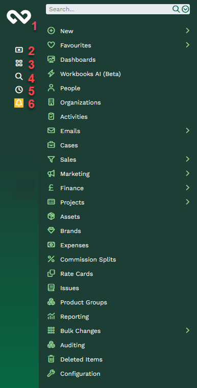 - Start Button – Clicking on the Start Button (Workbooks logo) opens the Start Menu; from here you can see all areas of Workbooks that you have access to, create new records, search for records, set your preferences, etc.