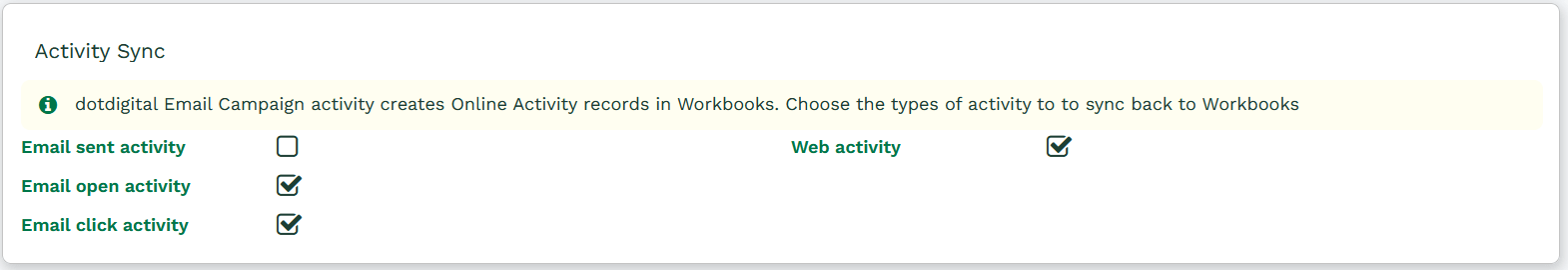 Once configured, click ‘Start Sync’ to automatically create a set of scheduled processes that facilitate communication between Workbooks and DotDigital.