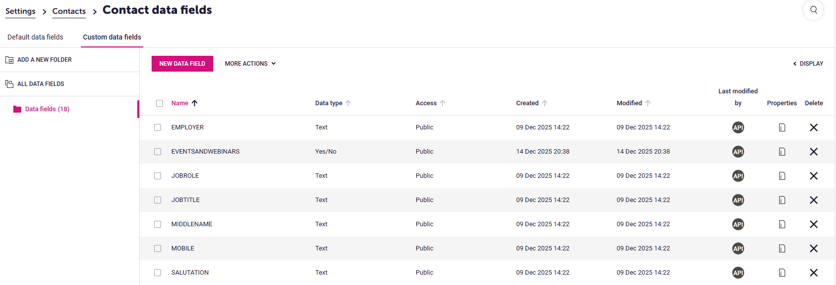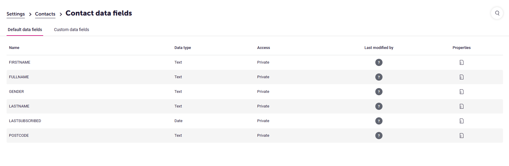 To add a data field in DotDigital, go to Settings → Contacts → Contact Data Fields. Here, you’ll see two tabs: Default Data Fields and Custom Data Fields.