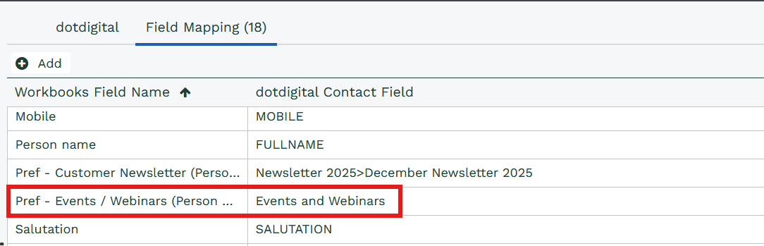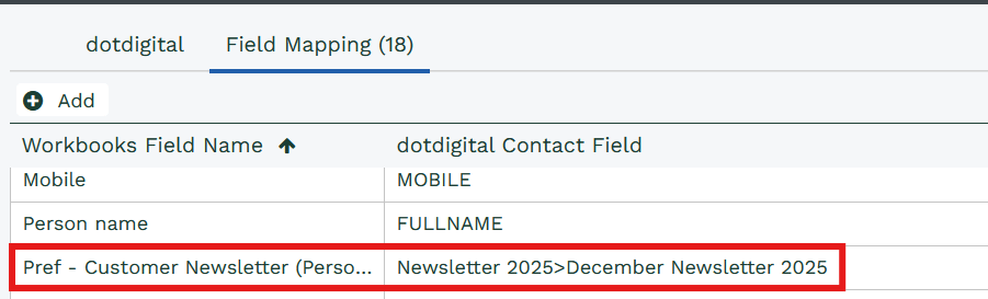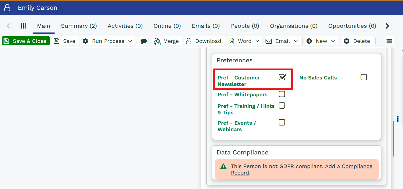 - Workbooks field: Pref – Customer Newsletter (Person only)