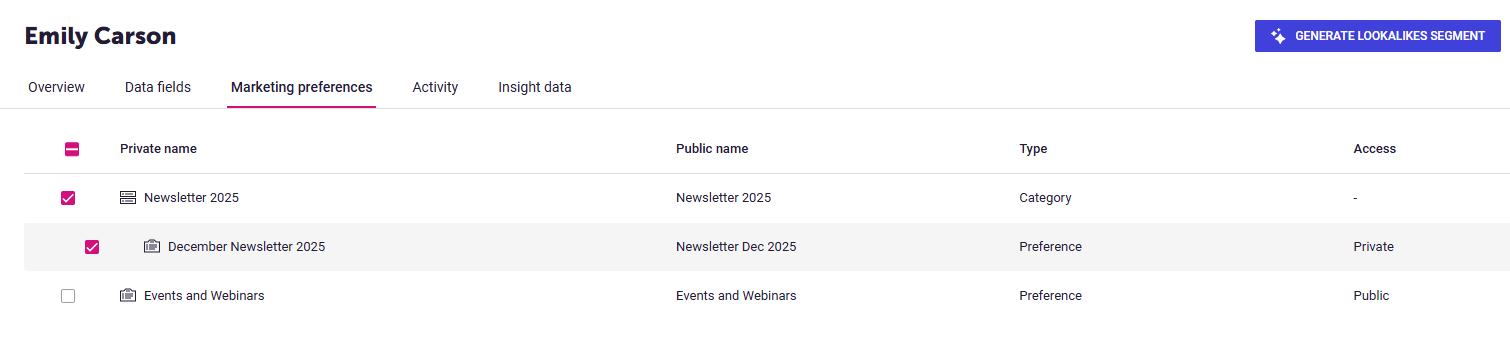 In the screenshot below, you can see that for the person record Emily Carson in Workbooks, the ‘pref-Customer Newsletter’ checkbox is selected. As this field is mapped to the nested DotDigital marketing preference ‘Newsletter 2025 > December Newsletter 2025’, Emily’s profile in DotDigital has been updated to show that she is opted in to this marketing preference.