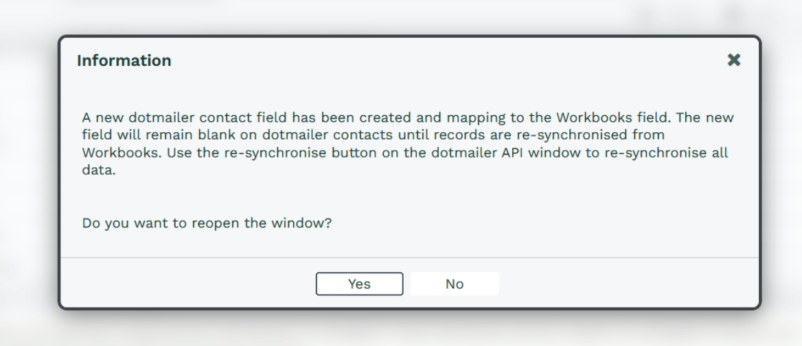 This indicates that the newly created DotDigital Field will only be populated on already synced contacts when a re-sync is run. Depending on the number of records in Workbooks and DotDigital, this process may take some time.