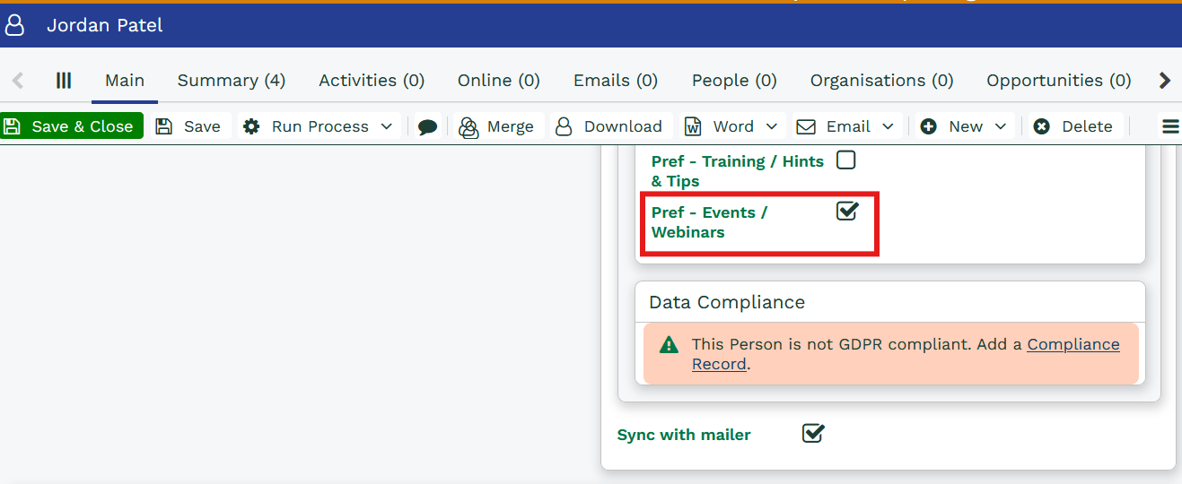 In the screenshots below, you can see that for the person record Jordon Patel in Workbooks, the ‘Pref-Events/Webinar’ checkbox is selected. As this field is mapped to the DotDigital marketing preference ‘Events and Webinars’, Jordon’s profile in DotDigital has been updated to show that she is opted in to this marketing preference.